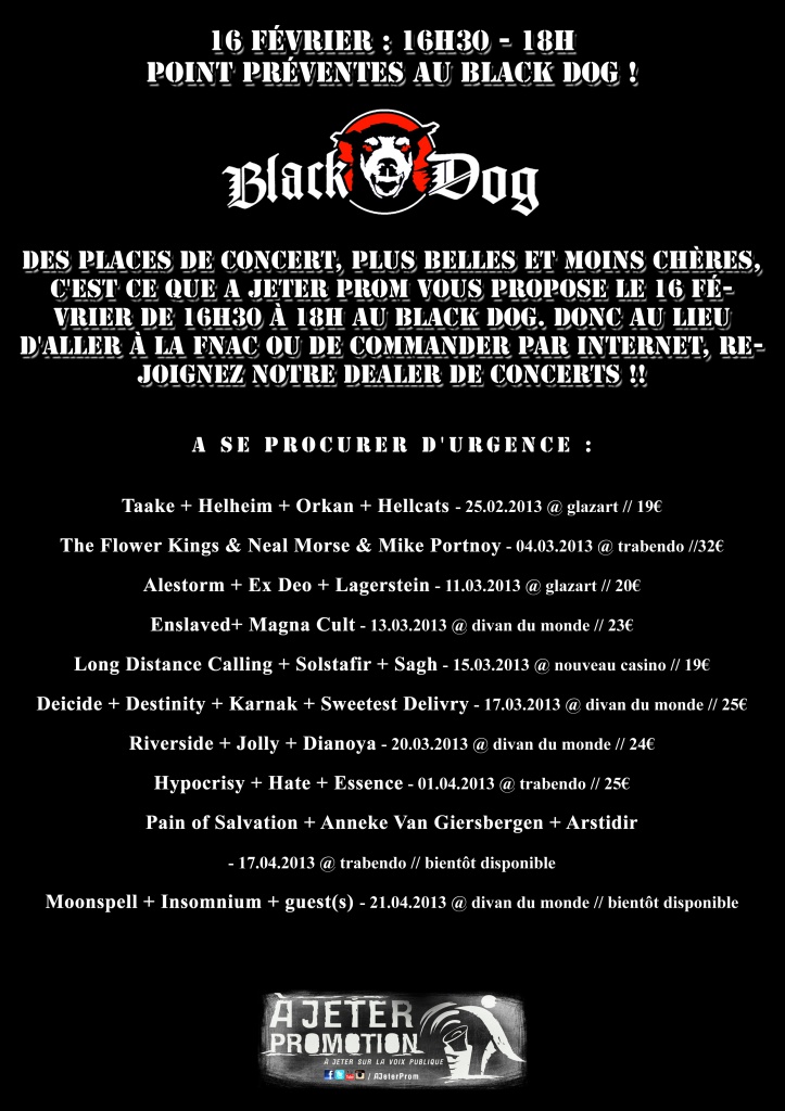 Avis aux parisiens : A Jeter Prom organise samedi 16 février à partir de 16h30 au Black Dog, un point préventes pour les billets -chers+jolis. Liste des concerts, tarifs et infos complémentaires dans le détail de la news. (VsGreg)