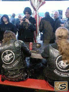 La signing session de Månegarm débute en parallèle. Alors que les autres groupes ont tourné à la bière ou aux jus de fruit, les Suédois ont apporté leurs munitions à picoler. Et ce n'était pas de l'eau! Peut-être que le violoniste le regrettera plus tard dans la nuit, quand il se fera rouler dans la boue tout bourré par les potes d'une nana qu'il emmerdait.