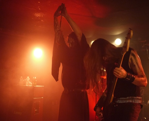 Le public est encore chaud du groupe précédent lorsque HORNA pénètre sur scène. Les regards sont tout d'abord attirés par le chanteur Spellgoth. Pied nu et vêtu d'une robe de bure, il met et enlève son capuchon à volonté, mais sans jamais headbanger. Son jeu de scène est très incantatoire, on le sent possédé par la musique du combo finlandais. Jouant beaucoup avec son chapelet satanique, il semble invoquer quelques forces obscures lorsqu'il n'est pas en train d'éructer avec haine les paroles des morceaux. Les autres membres sont dans un registre plus classique black metal, avec clous, cartouchières et corpsepaint dégoulinant. Seul le bassiste se cache derrière ses cheveux, qu'il agite par moment avec vigueur. Le second guitariste, Infection, lance continuellement un regard de dément à l'assistance, regard accentué par son maquillage et son crane rasé. Finalement, alors qu'il est le seul membre d'origine et véritable tête pensante, Shatraug est un peu plus en retrait, plus concentré sur son jeu, l'air un peu mal à l'aise. En parlant du jeu, il faut souligner une bonne prestation et interprétation ce soir. Les morceaux classiques et plus récents passent parfaitement l'épreuve de la scène, et les longs titres (comme Zythifer - Synkän Muiston Ääreellä) passent comme papa dans maman. Le groupe envoute et endort l'assistance pour mieux lui asséner les riffs mélodiques et mélancoliques, tout en le faisant participer. Un show carré et prenant, maitrisé tout en restant raw et agressif. Parfait pour terminer la soirée.
