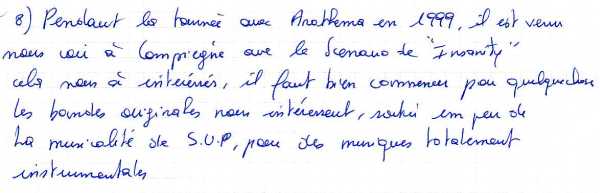 Nous y voilà, c'est sans doute ce qui intéressera les fans du groupe. Tout a commencé quand mon frangin a acheté « Room Seven » un disque que j'avais trouvé excellent même si la prod n'était pas top. Puis je me suis jeté sur « chronophobia », parce que j'avais aimé « room seven », mais surtout parce que j'ai été littéralement hypnotisé par la pochette du cd et le titre de l'album. Sensation difficile à décrire mais qui m'arrive rarement. Quand j'ai vu la pochette dans un magasin à Paris, le disque venait de sortir, j'ai été vraiment littéralement envouté. J'étais en pleine écriture de la première version du Sang du Châtiment et le cd tournait en boucle sur ma platine. Car en plus le concept de l'album m'était très personnel (mes liens avec mon frère) et évidemment musicalement c'était un album incroyable. En décembre 2000, j'ai été voir SUP jouer à Compiègne où j'habite, et on s'est rencontré après le concert. Je leur ai filé le scénar en leur disant que je voulais qu'ils fassent la musique, si ça les intéressait. On est devenu potes instantanément. Et puis nos relations n'ont fait que grandir, évidemment en ce qui concerne le travail de la création des bandes sonores des films, mais aussi et surtout pour une amitié de plus en plus forte et profonde entre nous. Je suis super content de ce qu'ils ont écrit pour mes courts. Je pense qu'à un certain niveau le fait qu'ils aient élargi leur musique pour mes films a eu un effet sur Imago (la présence des synthés notamment) et il est clair que je ne conçois les musiques de mes prochains films qu'avec Fab et Ludo. Je ne ferai pas de concession là-dessus, et tant qu'ils seront partants ils feront la zic pour mes films.