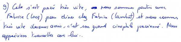 En fait une fois que le tournage est sûr à 100%, ils lisent le scénar, puis je leur fais parvenir le storyboard, qui est un outil très intéressant pour donner une idée du visuel du film. Celui du Sang…était particulièrement travaillé et abouti. Mais en fait c'est surtout à partir du rough cut du film (premier montage) que Fab & Ludo travaillent. On se réunit ensemble, on regarde le film, on discute des ambiances, des endroits où je veux de la musique,etc. Parfois je leur passe des cds de musiques de films où il y a des sons qui m'intéressent, et disons que j'essaie de donner une idée générale de ce que je veux. Mais c'est en fait très facile car Fab & Ludo sont de vrais cinéphiles, on a beaucoup de goûts communs en terme de cinéma, et ils comprennent vite ce que je veux dire. Je ne suis absolument pas musicien et c'est donc parfois difficile de transcrire ce que je souhaite, mais ils anticipent et dépassent largement mes attentes. Ensuite ils passent du temps à composer, me soumettent plusieurs morceaux ou sons et je dis oui ou non, et on avance comme ça jusqu'à avoir une maquette qui soit top, ce qui va vite. Pas mal de morceaux restent sur le bord du chemin mais pourront resservir pour d'autres projets, et puis ça me fait des super collectors !!!