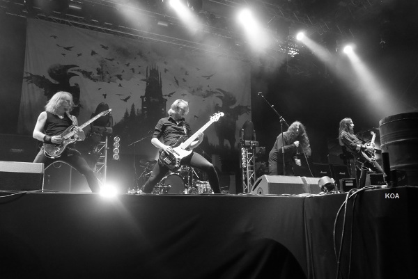ATLANTEAN KODEX : en retirant les pass, je remarque que "Enthroned in Clouds and Fire" retentit dans l'air. Il n'est que 19h25, mais les Allemands ont déjà commencé en avance leur set. On gare la voiture en quatrième vitesse et direction le devant de la scène. Le groupe est en train de jouer le second titre du set, "Sol Invictus", qui ouvre leur deuxième album. Le son est excellent et le groupe est en forme. Le chanteur communique avec parcimonie avec le public, qui lui rend étonnamment bien. Le succès va grandissant pour le groupe, mais le public présent est vraiment nombreux et très réceptif, chantant les morceaux et les riffs (sur "Twelve Stars and an Azure Gown"). Le chant est très juste, tous comme ses acolytes, mis à part quelques hésitations sur certains riffs, notamment clairs, l'exécution est très proche de la version album. ALTANTEAN KODEX réussit parfaitement à retranscrire toute l'émotion de son heavy épique sur scène. Un concert heavy qui donne envie de headbanguer, mais également qui donne la chair de poule.